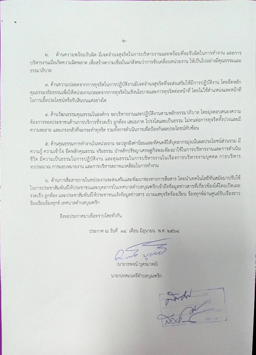 วันจันทร์, 14 มิถุนายน 2564 10:45ประกาศเทศบาลตำบลบุณฑริก เรื่องเจตจำนงทางการเมืองในการต่อต้านการทุจริตของผู้บริหาร ของเทศบาลตำบลบุณฑริก ประจำปี2564