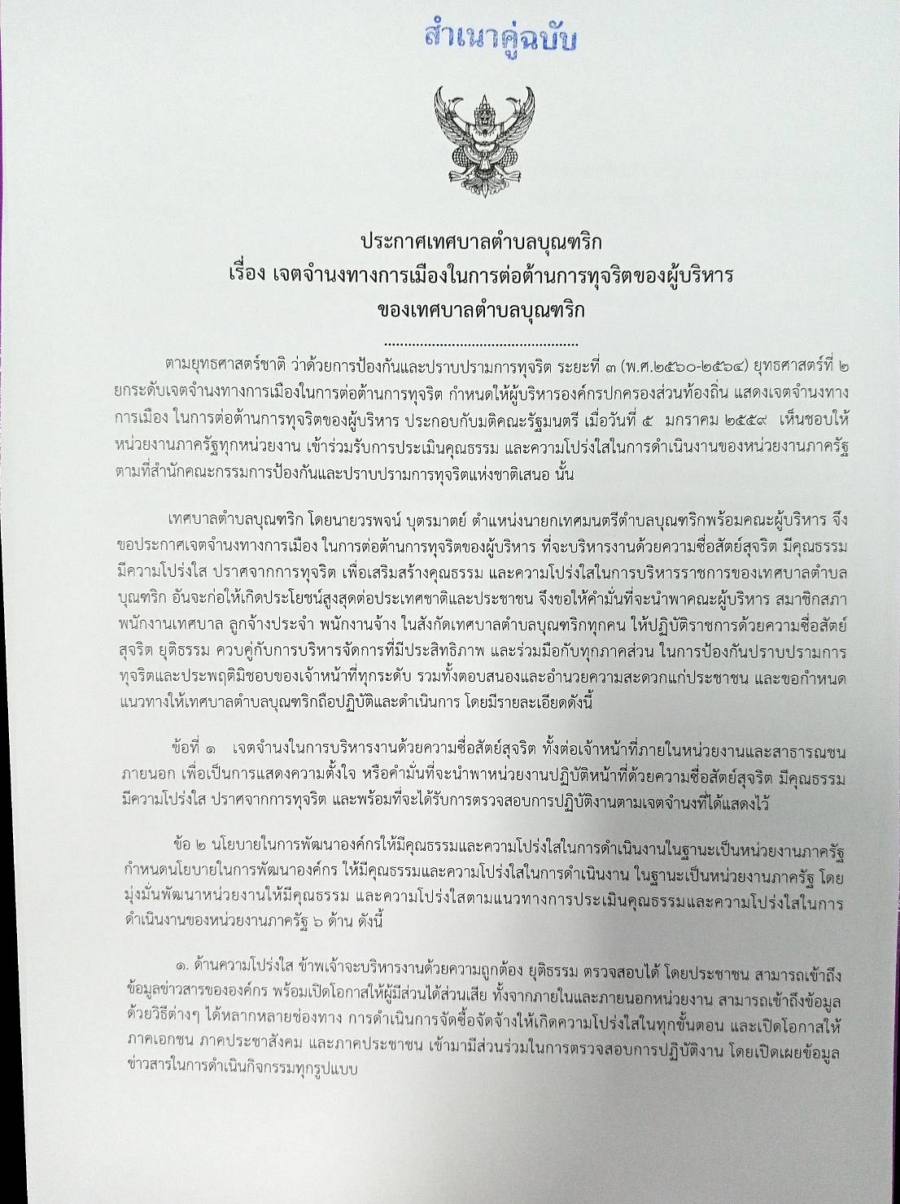 ประกาศเทศบาลตำบลบุณฑริก เรื่องเจตจำนงทางการเมืองในการต่อต้านการทุจริตของผู้บริหาร ของเทศบาลตำบลบุณฑริก ประจำปี2564