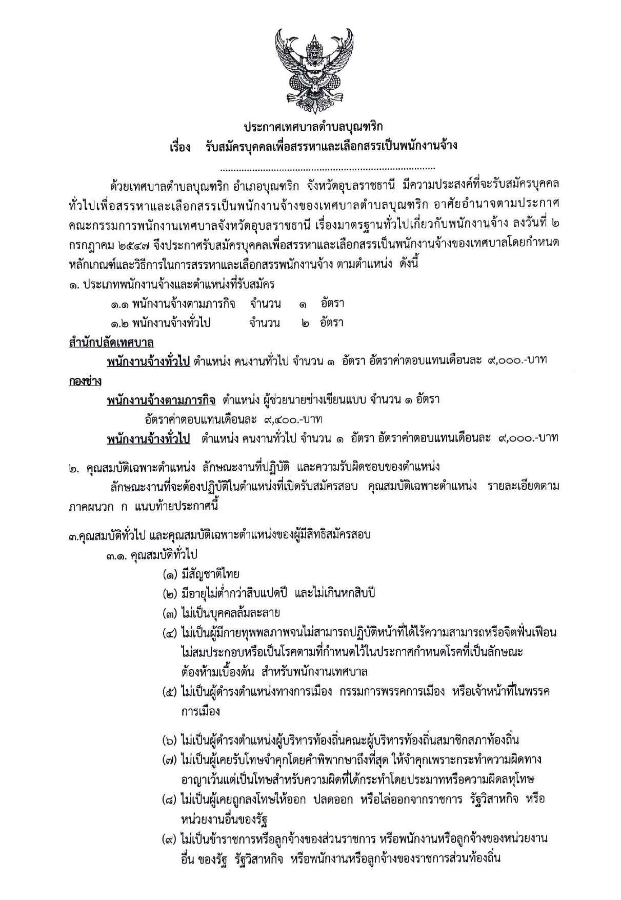ประกาศเทศบาลตำบลบุณฑริก เรื่อง รับสมัครบุคคลเพื่อสรรหาและเลือกสรรเป็นพนักงานจ้างเทศบาลตำบลบุณฑริก